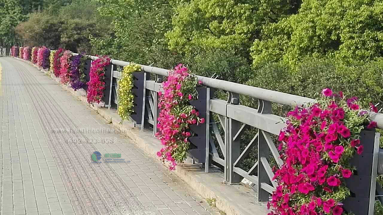 現(xiàn)在我們使用鞍馬形式的花盆將原本生硬的隔離護(hù)欄上掛滿花盆種植各色的花卉。鞍式花盆就這樣隔離道路中央形成獨(dú)特的道路景觀。