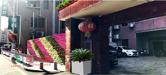 圍墻景觀提升:現(xiàn)場(chǎng)原圍墻墻體色彩單一,年代久遠(yuǎn);采用植物墻模塊式花盆(5012)對(duì)墻體進(jìn)行綠化包裝,從色彩上可以有多重選擇(見上圖),且具有很強(qiáng)烈的花街特色;為了迎合墻體綠化,在門樓頂部放置頂式花盆(8430)進(jìn)行頂部景觀提升,燈桿利用立體花柱進(jìn)行景觀提升,并且在門口放置兩個(gè)花箱。