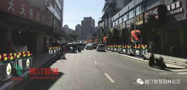 道路景觀提升:由于左側(cè)人行道較窄,我們可以放置一桶一鏈?zhǔn)交ㄏ洌ê着瑁咳齻€(gè)花箱放一起;右側(cè)人行道,放置3+2藝術(shù)花箱或者“君子”組合藝術(shù)花箱,從而達(dá)到道路兩側(cè)綠色包裝的效果。