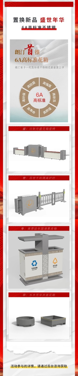 一、無(wú)界置換:不限品牌、材質(zhì)與年限,各類花箱、護(hù)欄、座椅及垃圾桶均可參與置換抵扣活動(dòng)。可以直接以廠家直供的超值價(jià)格,換取“盛世年華”系列新品。