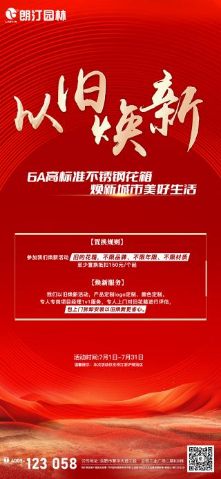 為響應(yīng)城市更新號(hào)召,以換新煥新城市美好生活。朗汀園林特推出“以舊煥新”活動(dòng)。無論您的花箱材質(zhì)如何、品牌何屬、年限多久,只要面臨銹蝕、掉漆、變形、破損等問題,均可參與活動(dòng),抵扣置換“盛世年華”系列6A高標(biāo)準(zhǔn)不銹鋼城市家具產(chǎn)品。