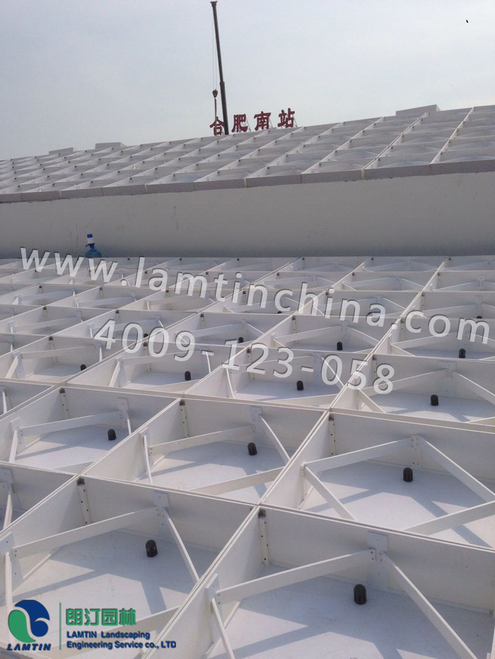 國慶期間,合肥高鐵南站工程在緊鑼密鼓的進行著,位于南站北面兩側(cè)的3000平方米的屋頂綠化方案由北京城建集團總設(shè)計師主導(dǎo)設(shè)計,整體屋頂呈高低起伏,具有大山層巒疊嶂之感。此次屋頂綠化方案的實施沒有采用以往的塑料花盆,蓄排水板,堆砌覆土等方式而是采用了PVC微發(fā)泡花箱的形式,朗汀在屋頂綠化領(lǐng)域的嘗試有了新的突破。