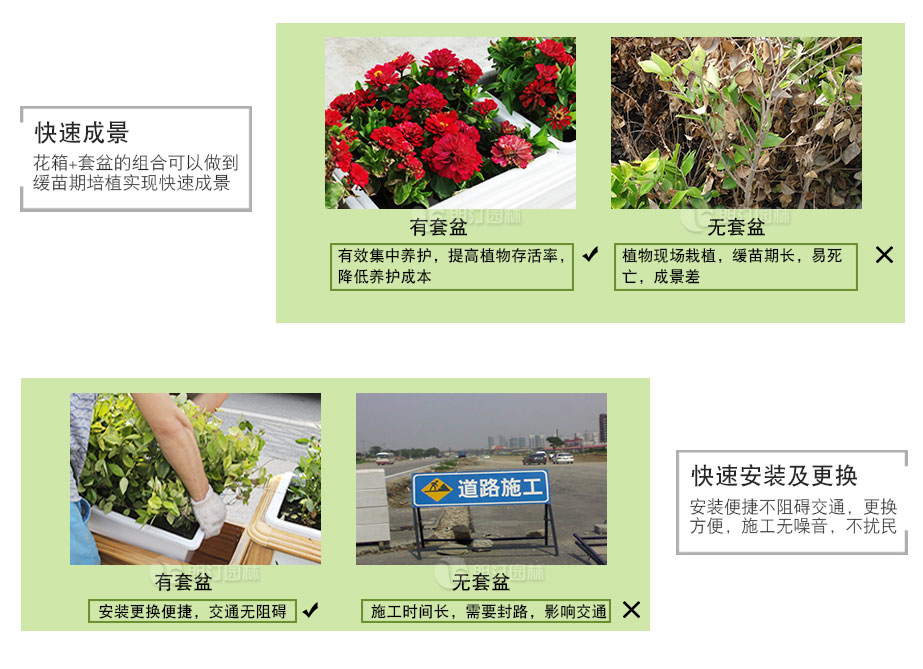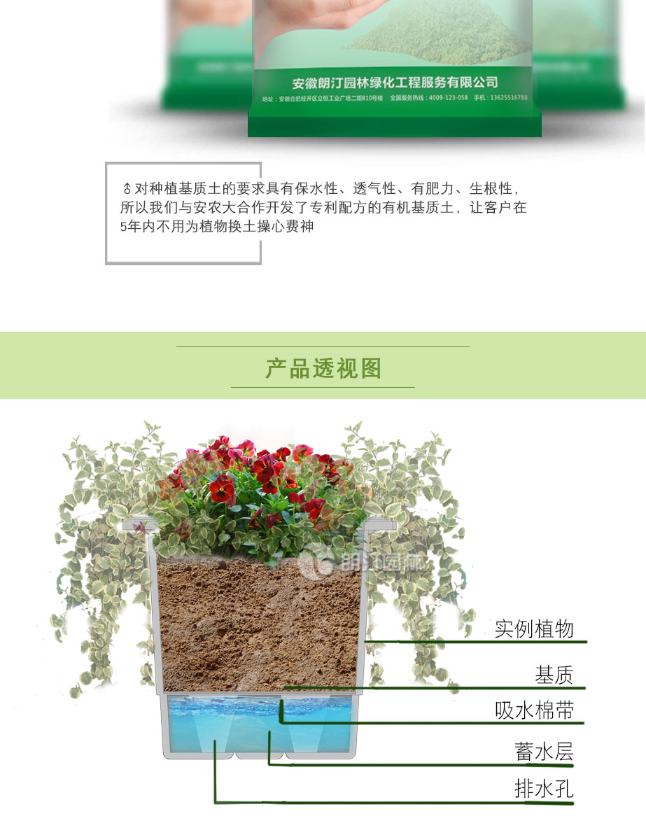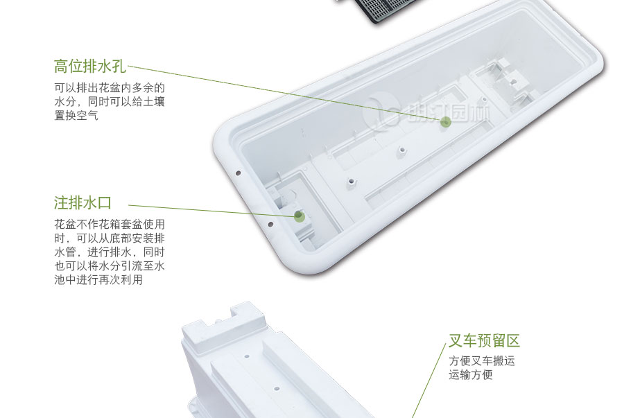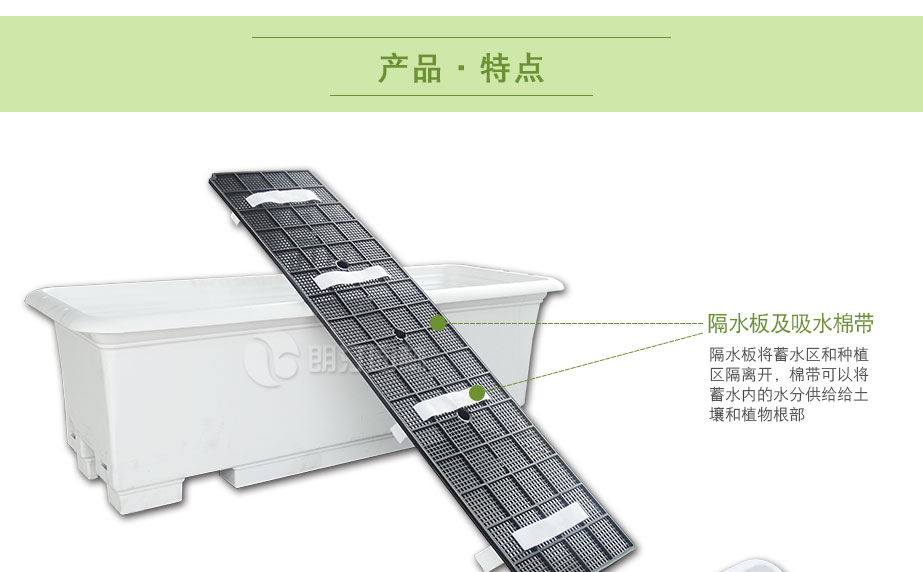 特點:食品級PP原料環(huán)保無毒,耐高溫,自帶蓄排水功能,土層深度適合小灌木生長。